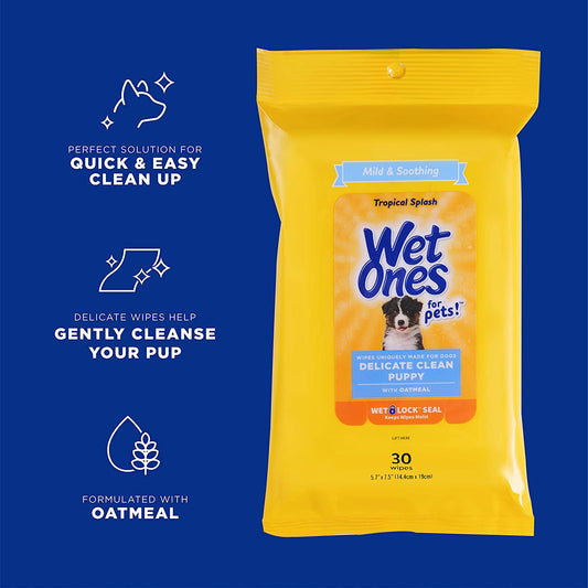 for Pets Delicate Clean Puppy Cleaning Wipes with Oatmeal | Mild & Soothing Puppy Grooming Wipes in Tropical Splash Scent, Wipes with Wet Lock Seal | 30 Ct Pouch Dog Wipes